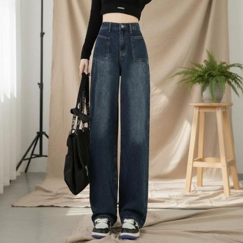 하이웨스트 청바지 체크 디자인 슬림 일자 빅사이즈 와이드 데님팬츠 파란색 S