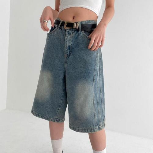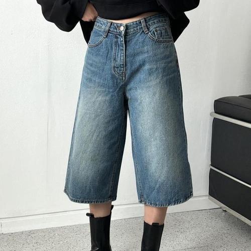 디에이치알 7부 버뮤다 워싱 와이드 데님 팬츠 청반바지