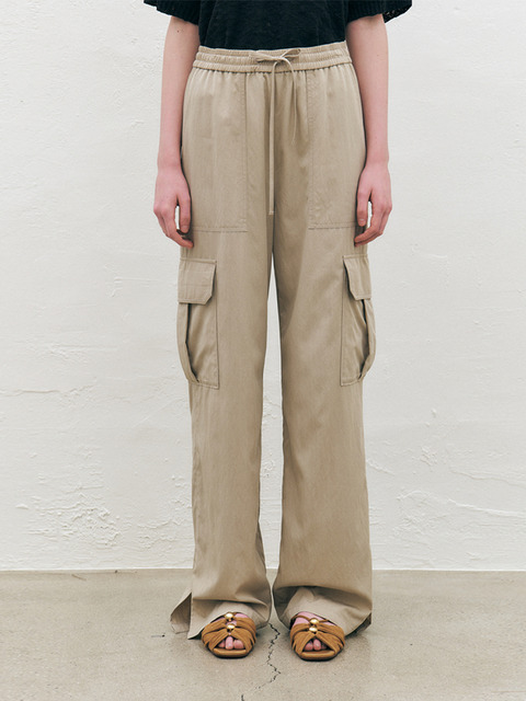SAHINER 여성 와이드 핏 카고 포켓 얇은 팬츠 밴딩 봄여름 BKZ16