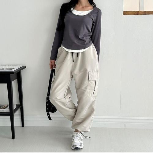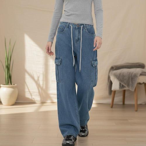 [옷자락] 여성용 일상용 와이드 스트링 카고바지