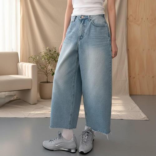 [옷자락] 여성 와이드핏 벌룬 연청 데님팬츠