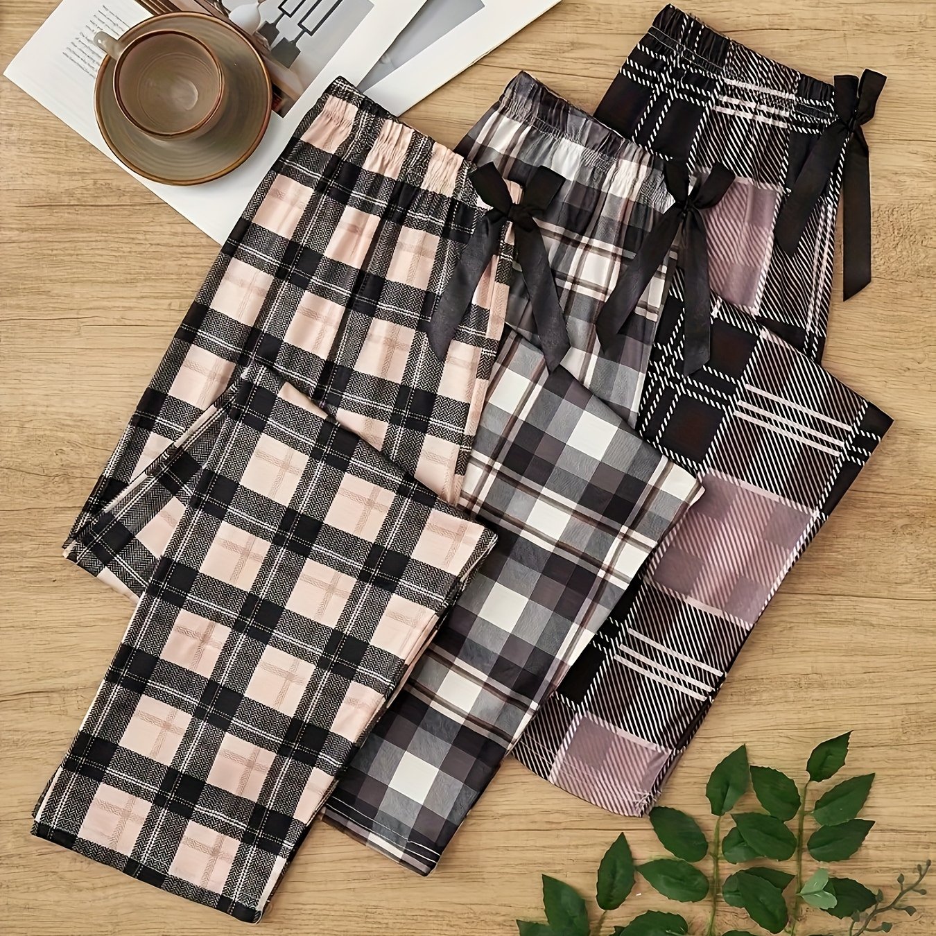TEMU 여성용 3피스 벨트 체크 무늬 프린트 잠옷 바지, 편안한 원단과 넉넉한 핏으로 매일 함께, 정교한 체크 무늬 프린트가 장식되어, 탄성 허리 밴드 롱 팬츠, 편안하고 넉넉한 잠옷 홈웨어 세트|잠옷