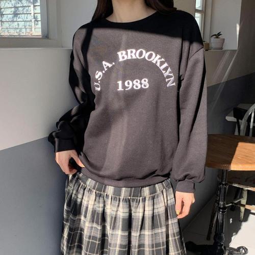 |KHT9EE9|여성 빈티지 자수 오버사이즈 기모 라운드넥 맨투맨