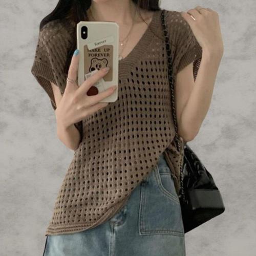 V넥 베스트 그물니트풀슬리브 숏탑 오버핏 심플패턴 망사