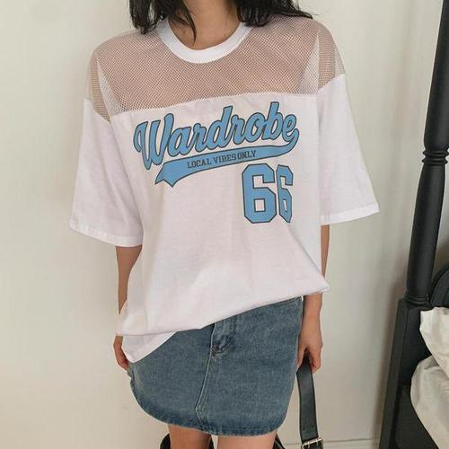 [옷자락]여자 오버핏 레터링 메쉬 브이넥 반팔 티셔츠