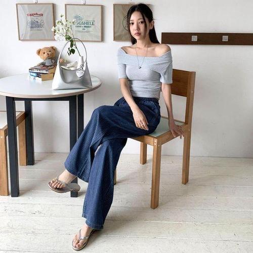 [옷자락] 여성 골지 오프숄더 셔링 크롭 반팔 니트