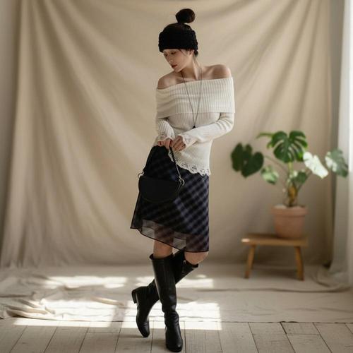 [하프클럽/휴드]보트 오프숄더 하이넥 믹스 스타일 슬림 니트 탑