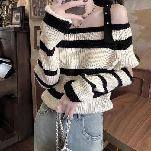 [에이치플러스몰]여성 유니크 스트라이프 오프숄더 트임 니트