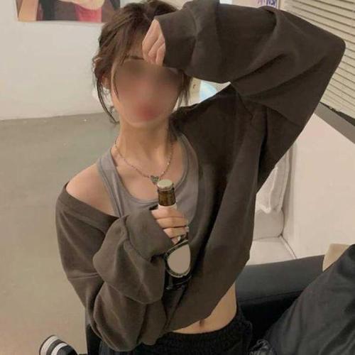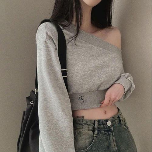 [셀럽하우스]크롭 ASPR7493 맨투맨 원 오프숄더 긴팔 한쪽 어깨 트임 3색