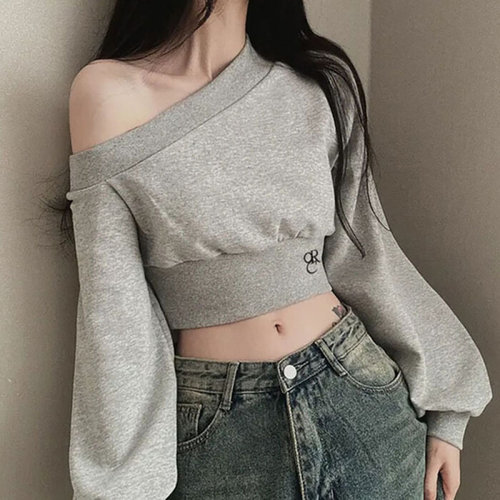 [옷자락]여자 오프숄더 크롭 트임 벌룬 박시 오버핏 맨투맨