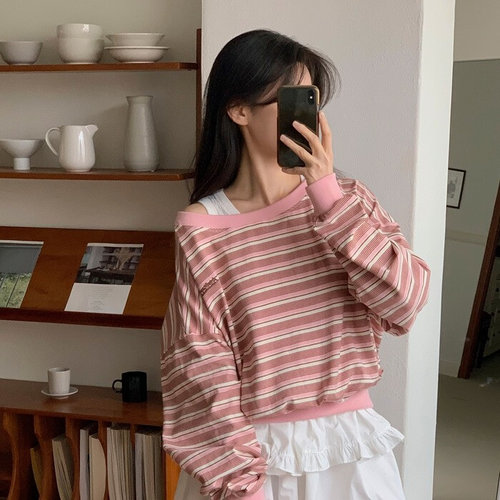 플러리싱 / 루즈핏 스트라이프 오프숄더 보트넥 맨투맨 플러리싱