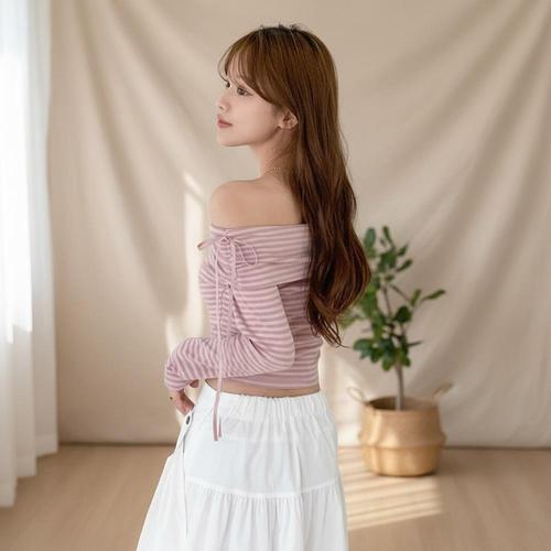 [옷자락] 여성 오프숄더 스트라이프 크롭 긴팔 티셔츠
