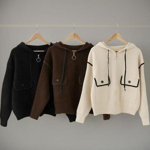 [신상오픈런]|CSJ679C|여성 오링 후드 집업 니트 배색 포켓 긴팔 골지 스웨터