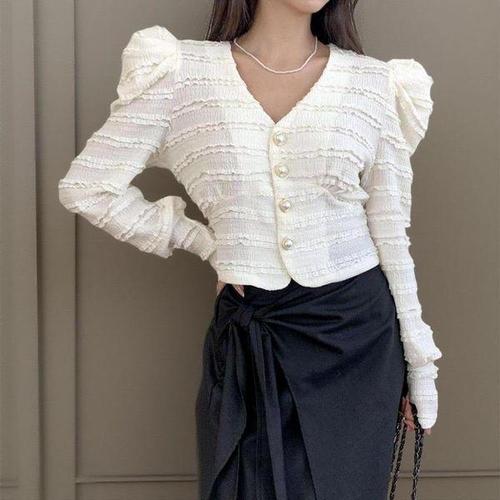 [신상오픈런]여성 오피스룩 퍼프 소매 트위드 브이넥 프릴 가디건