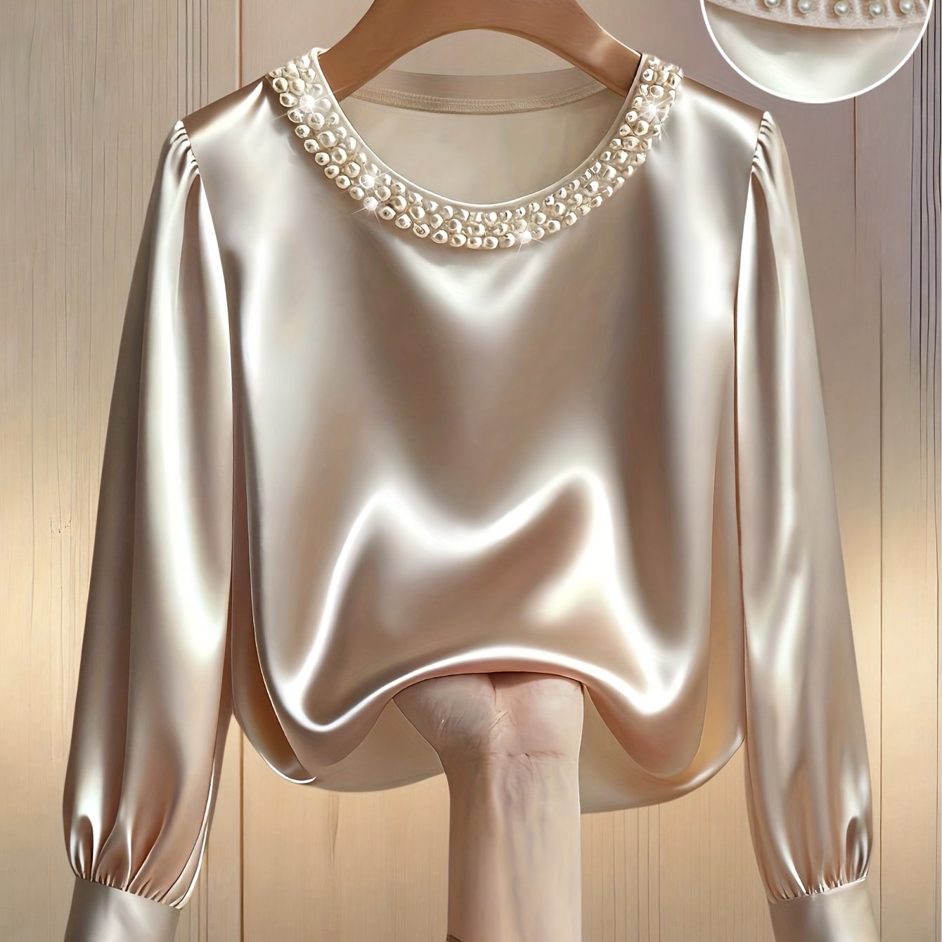 TEMU 여성용 봄/가을 패션 우아한 라운드넥 진주 장식 긴팔 티셔츠, 데이트/출근/저녁 행사 및 일상복으로 적합