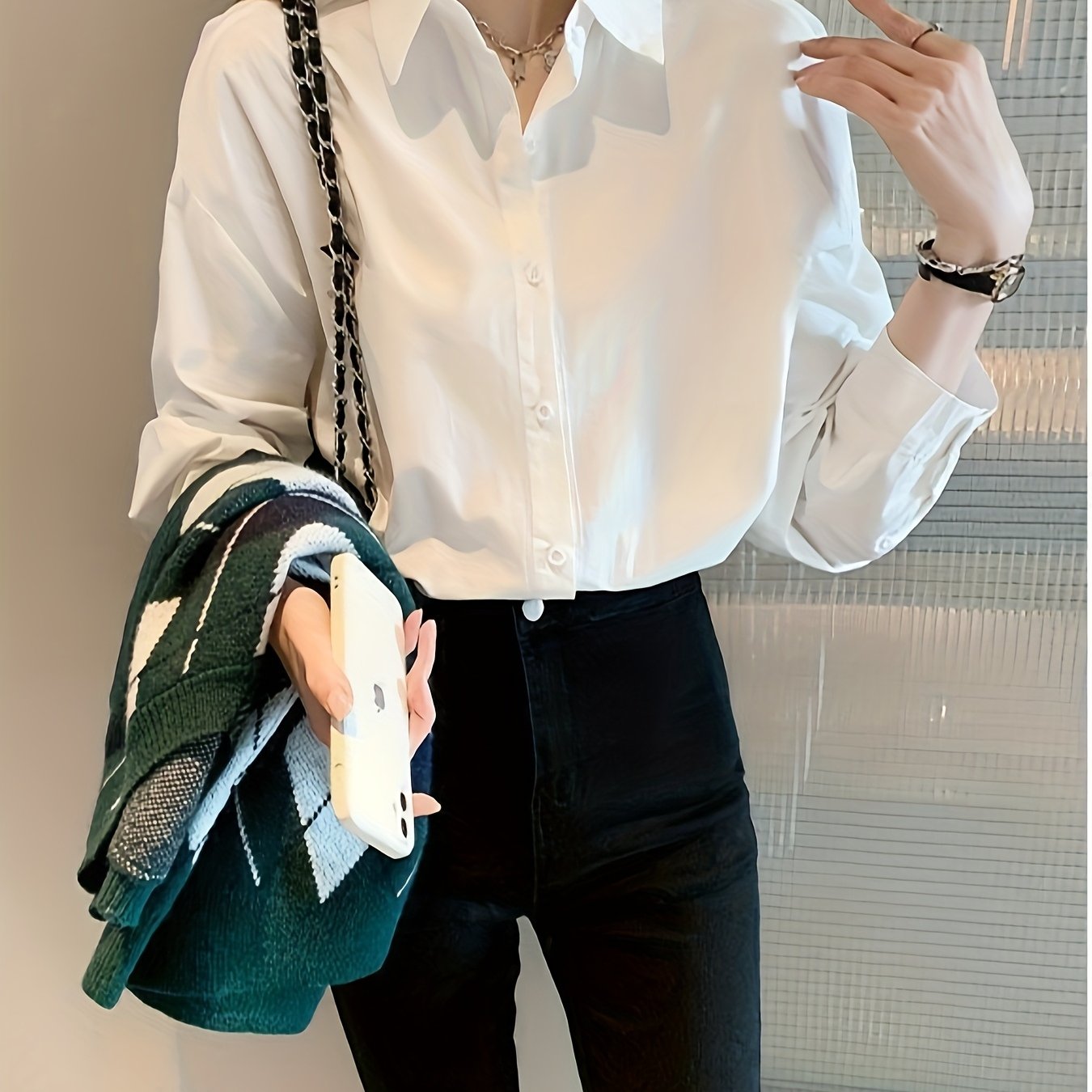 TEMU 여성용 우아한 화이트 롱슬리브 셔츠 - 턴칼라, 프론트 버튼, 대비 포인트 디자인 - 오피스 캐주얼 봄/가을 신상 솔리드 컬러 패션 다용도 커뮤터 심플 스타일 YTD