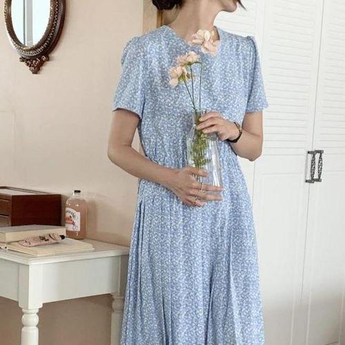 [신상오픈런]카디느 숏슬리브 플레어 썸머 플리츠 잔꽃 여성 긴원피스
