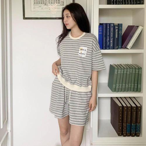 |KHD25E3|여성용 스트라이프 면 패치 티셔츠와 반바지 세트