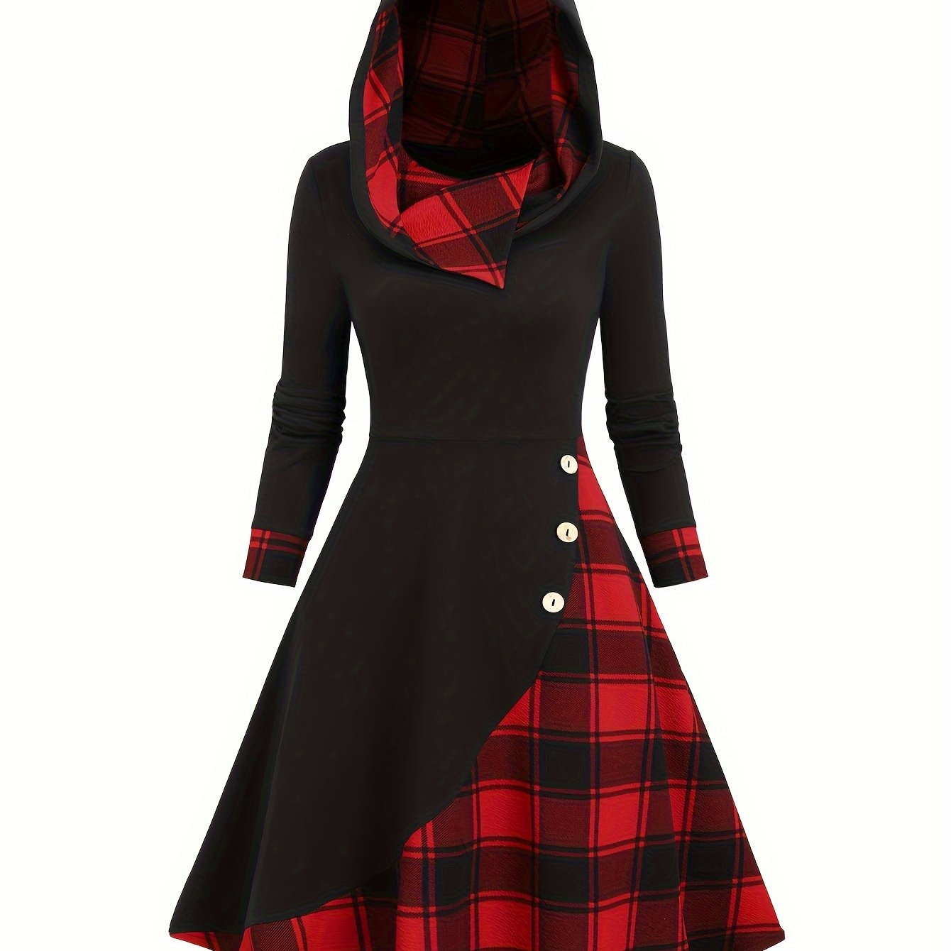 TEMU 체크 무늬 후드 긴팔 원피스 | 캐주얼 스타일, 컬러 블록 디자인, 가을/겨울에 적합