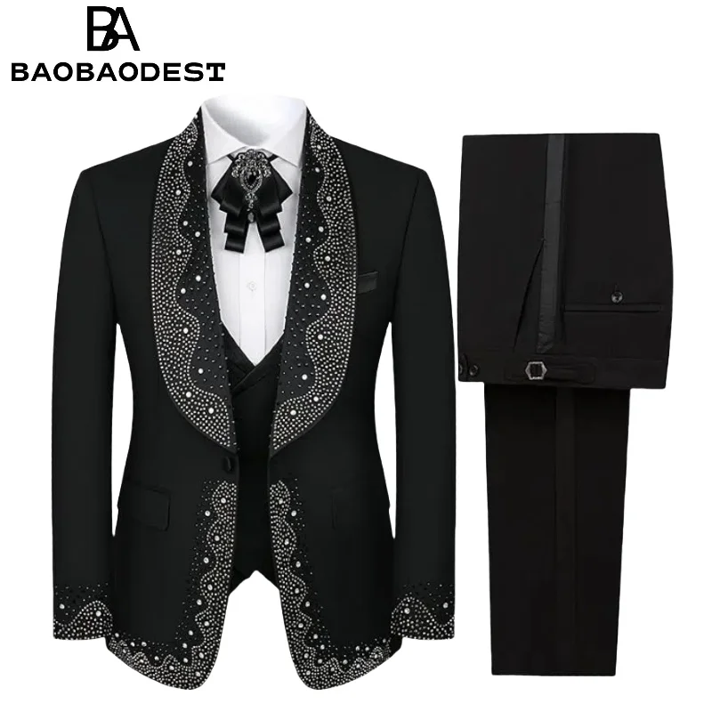 남성용 3피스 럭셔리 다이아몬드 숄 라펠 턱시도 세트 | 신랑/프롬 레드 카펫 이벤트를 위한 블랙 웨딩 슈트(블레이저+조끼+바지)