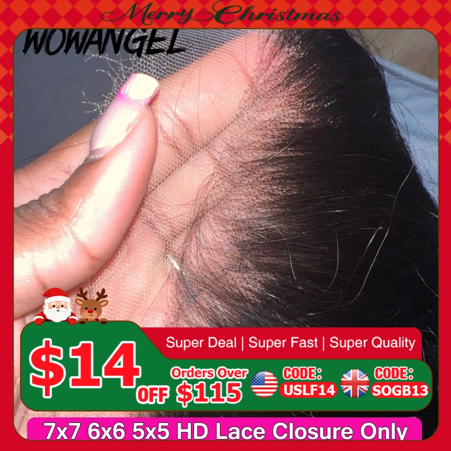 와우 엔젤 7x7 6x6 5x5 HD 레이스 클로저 정면 인모 스트레이트 헤어 멜트 스킨, 사전 발모 HD 레이스 클로저 버진 헤어
