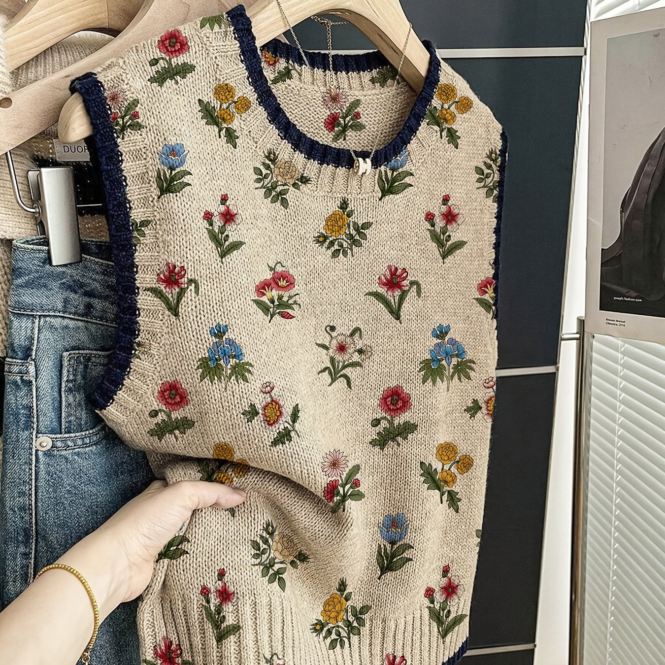 TEMU 우아한 플로럴 프린트 여성용 크루넥 풀오버 조끼 | 고품질, 컬러 블록, 올 시즌, 캐주얼 다용도 착용