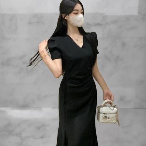 [다잇템_패션]여성 V넥 인어공주 검정 벌룬 슬리브 롱 드레스