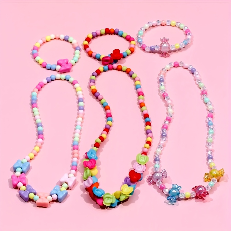 TEMU 6개 세트 소녀용 귀여운 매력 팔찌와 목걸이 세트, 리본, 꽃 & 구슬 디자인, 축제 파티 생일 선물용, 랜덤 컬러, 청소년용