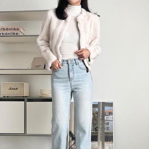 라뷰드 루즈핏 물결 밍크 페이크퍼 숏코트 여성 겨울 인조퍼 크롭 자켓 부드러운 노카라 점퍼 사이드 포켓 아우터 오버핏 미디 외투