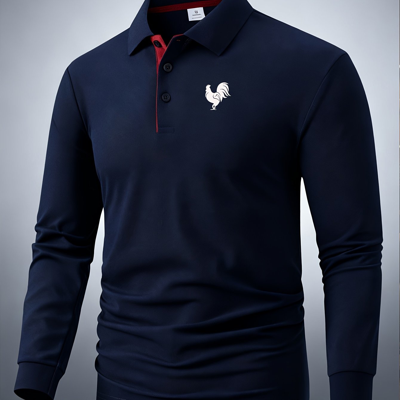 TEMU C8-505 수탉 로고 신상 고급 컬러 블록 남성용 프린트 긴팔 폴로 셔츠, 남성을 위한 스타일리시한 캐주얼 스포츠 탑, 편안하고 통기성이 좋은 원단으로 제작되었으며, 버튼 칼라가 있는 다용도 레귤러 핏을 특징으로 합니다.