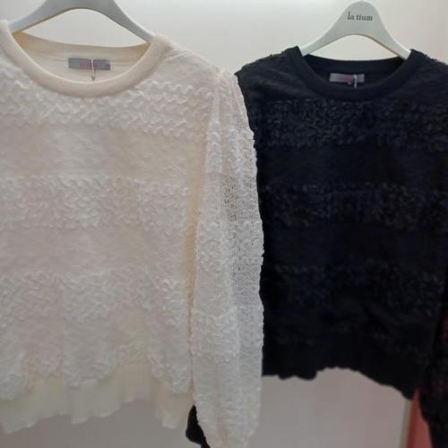 Latium HC06 시스루 소매 입체 꽃잎 배색 플로라운드 니트티블라우스 T253