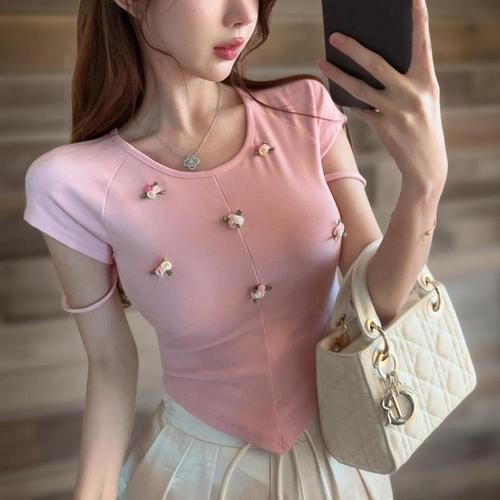 |CCT9400|여성 슬림핏 언발랄 입체 꽃무늬 크롭 반팔 티셔츠
