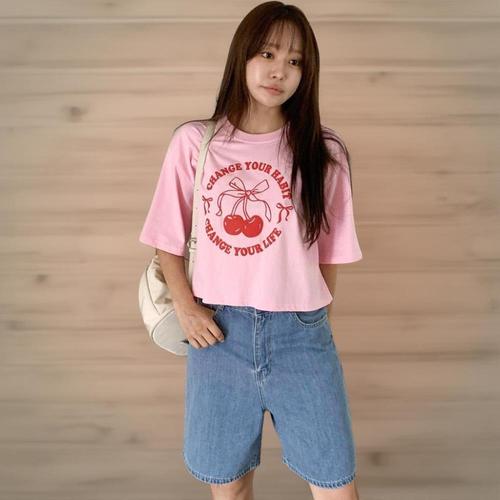 |KHT9495|여성 세미크롭 반팔 티셔츠 체리 입체 발포 캐주얼 스타일