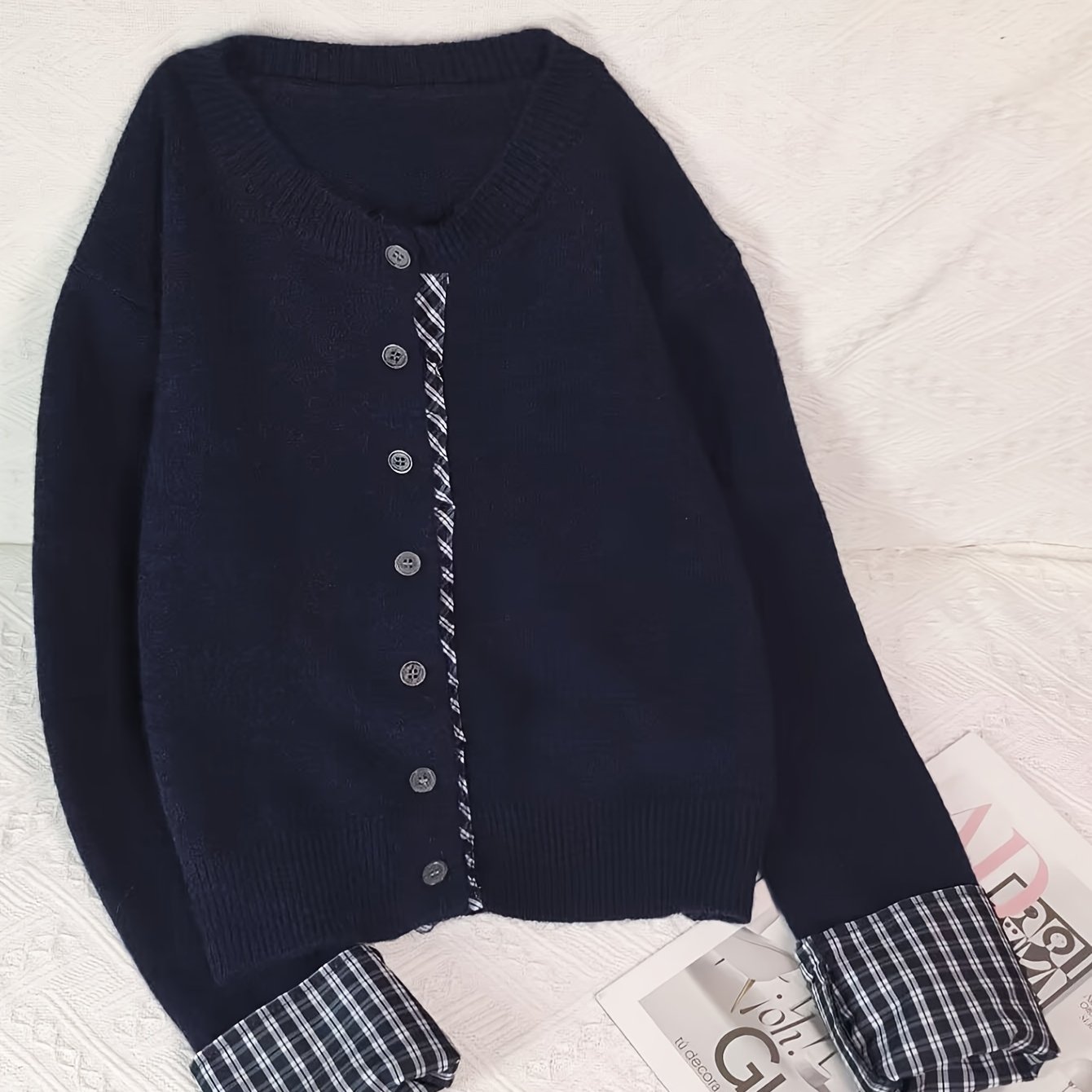 TEMU 여성용 한국 스타일 투톤 체크 스웨터 코트, 달콤하고 젊은 카디건 아우터웨어