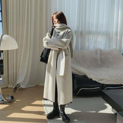[신상오픈런]여성 울 롱 코트 노카라 머플러 세트 루즈핏