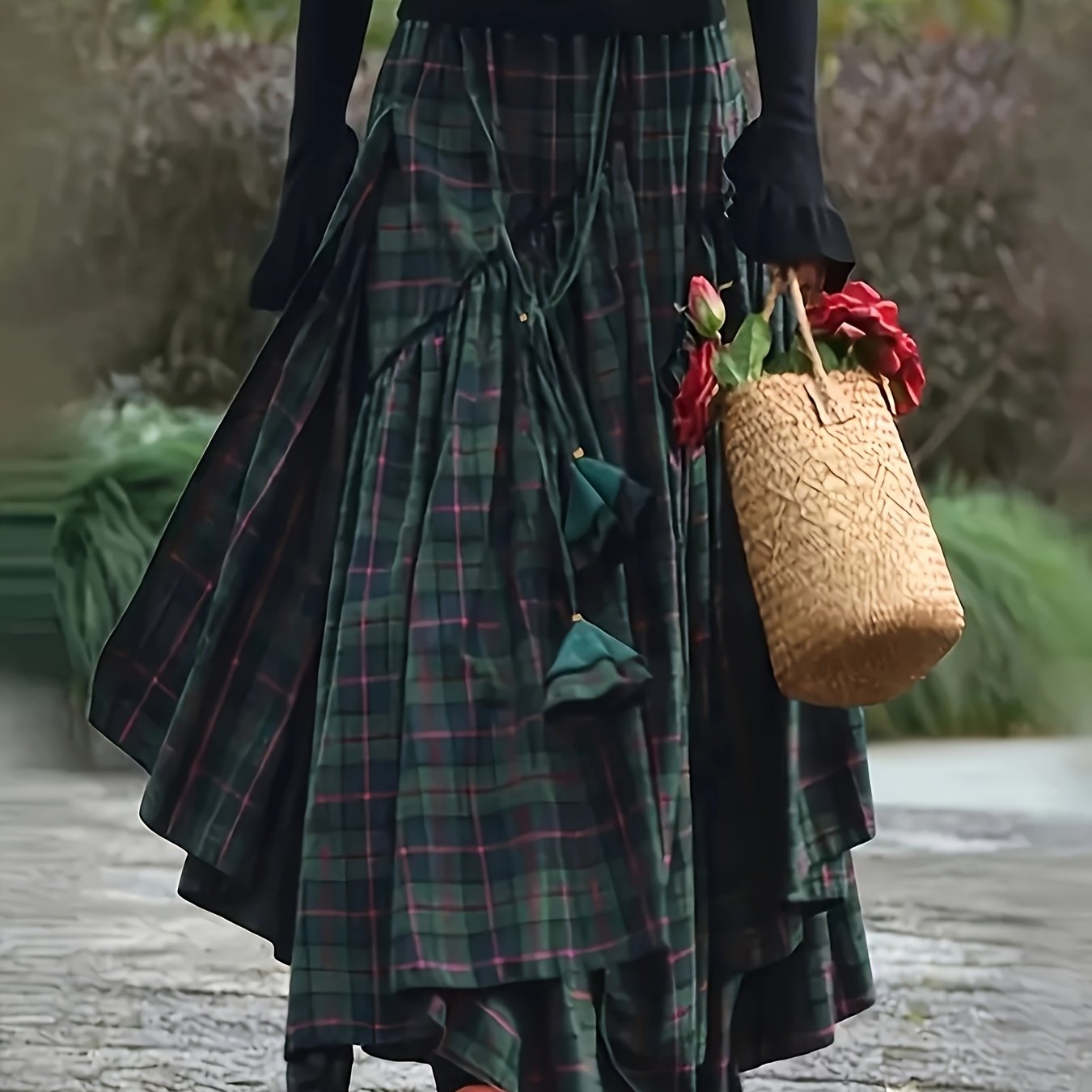 TEMU 여성용 빈티지 비대칭 티어드 맥시 스커트 - 양면 체크무늬, 루즈한 A라인 실루엣, 봄 & 가을용 폴리에스터 긴 스커트, 세탁기 사용 가능|빈티지