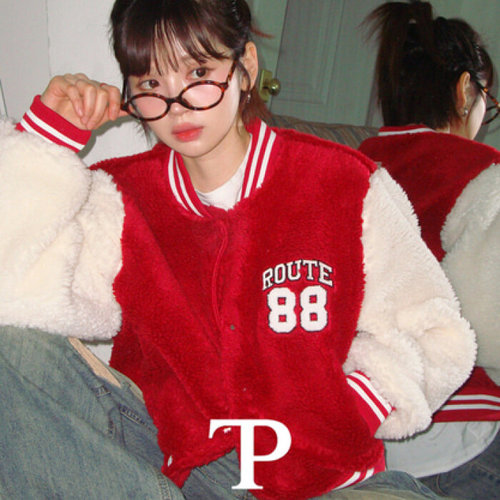 더핑크 / 르제 루즈핏 자수 배색 뽀글이 양털 바시티 자켓 점퍼