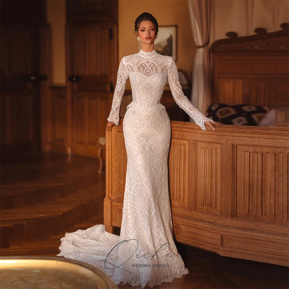 QICHE 보헤미안 레이스 롱 슬리브리스 머메이드 웨딩 드레스 여성용 2026 하이 칼라 오픈 백 스윕 트레인 로브 드 마리에 맞춤 제작