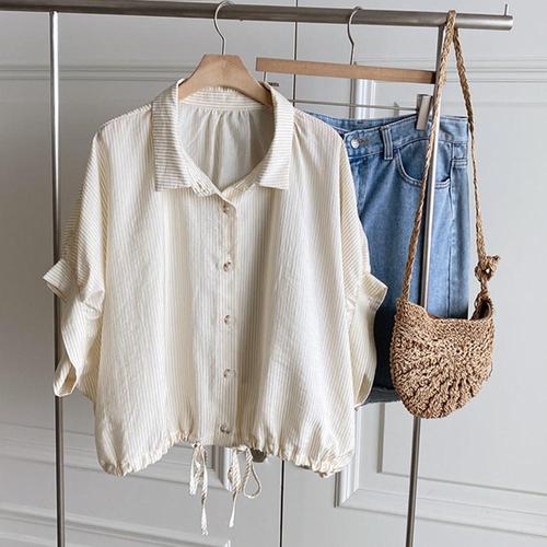 [샵앤][샵앤] 여성 카라넥 잔스트라이프 루즈핏 반팔 블라우스 BONG-WBL-4510-옐로우