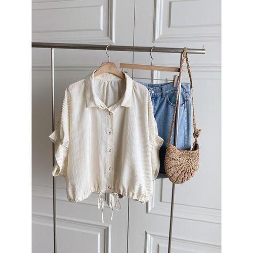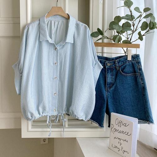 [샵앤][샵앤] 여성 카라넥 잔스트라이프 루즈핏 반팔 블라우스 BONG-WBL-4510-블루