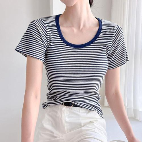 [다잇템]여자 줄무늬 얇은반팔 잔골지 티셔츠