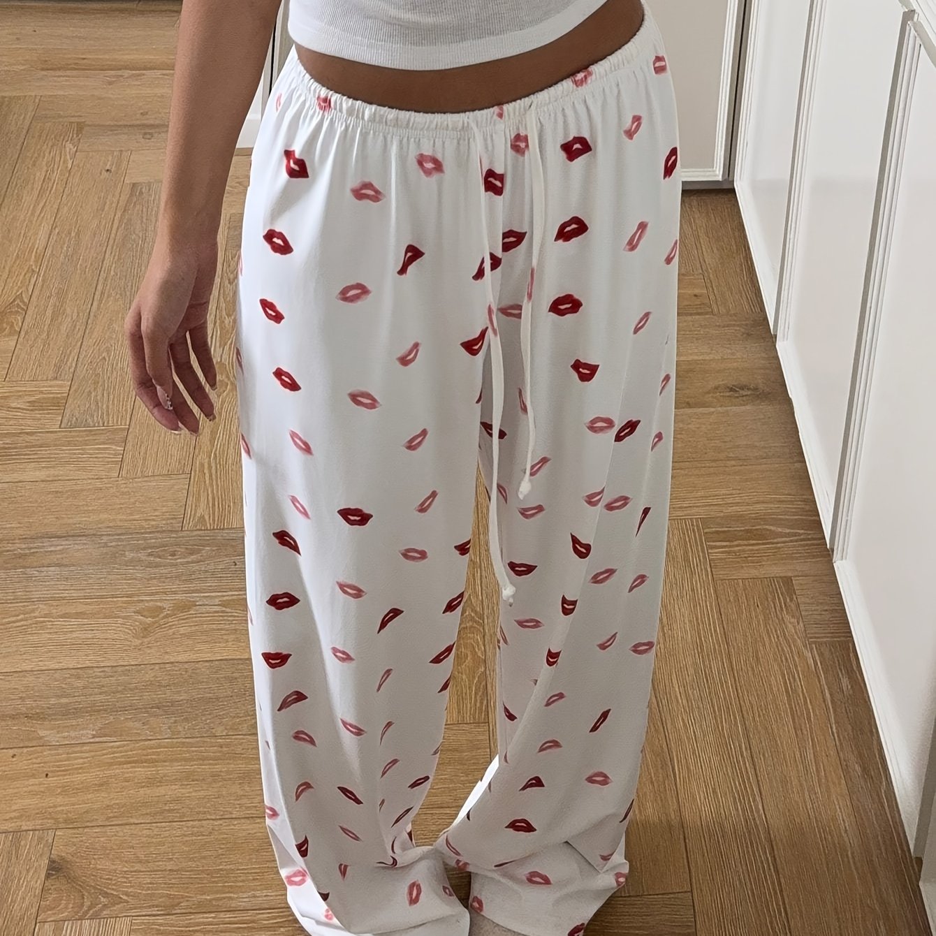 TEMU 여성용 립 프린트 드로스트링 허리 루즈핏 캐주얼 바지 - 화이트 레드 립 프린트, 편안한 레그 바지, 캐주얼 의상 및 잠옷, 다용도 레깅스 | 드로스트링 허리 밴드 | 거품 효과, 립 프린트 팬트