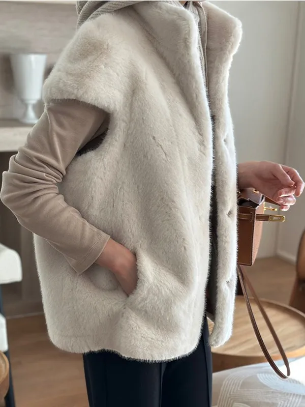 고품질 여성용 루즈핏 따뜻한 인조 모피 조끼 가을 겨울 아우터 폴리에스터 섬유 스탠드 칼라 민소매 워터 래빗 퍼