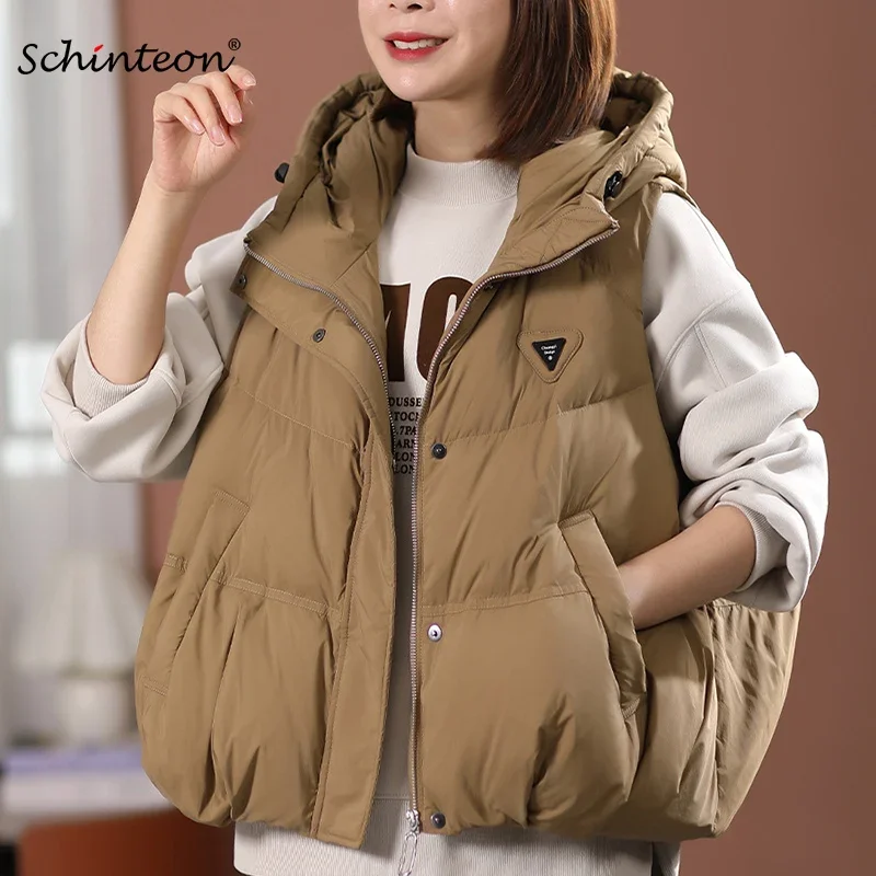Schinteon 여성 90% 화이트 오리 다운 조끼 후드 캐주얼 민소매 자켓 단순 솔리드 컬러 세련된 가을 겨울 탑 New