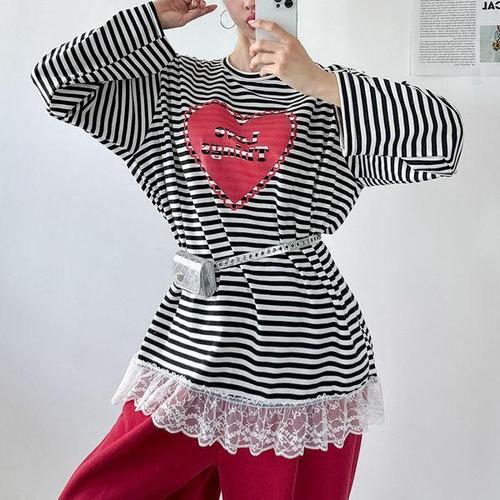 [다잇템]여자 줄무늬 하트긴팔티 키치룩 레이스 티셔츠