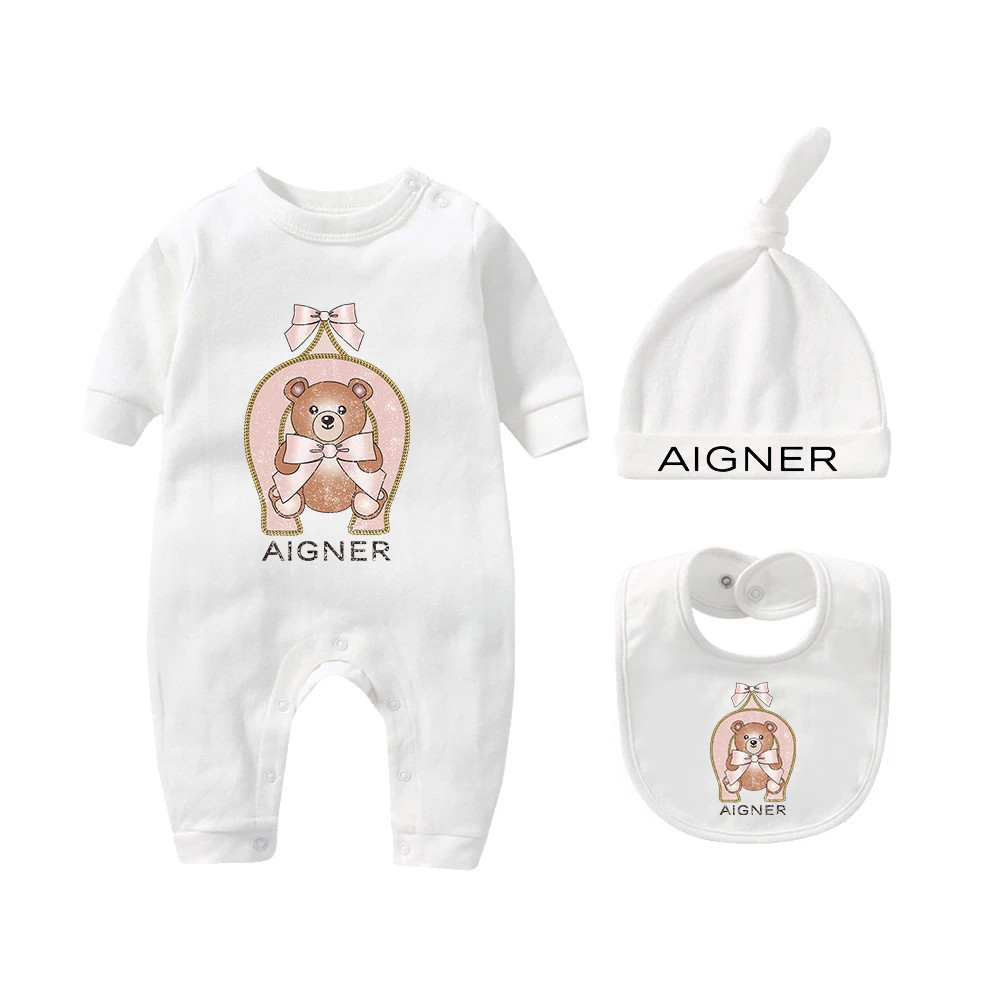 귀여운 곰 점프수트, 신생아 옷, 가을 새로운 스타일, 아동 점프수트, 모자, 턱받이, 스카프 세트, 여아 긴팔 점프수트