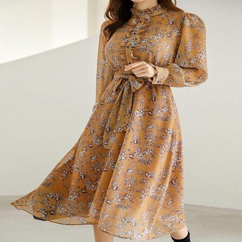[셀러허브_여성트랜드패션]ONM 패턴 원피스 플라워 프릴 긴팔 쉬폰 봄가을 롱스