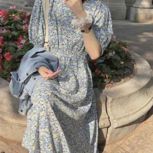 [다잇템]여성 플라워패턴 에이라인 시폰 파란색 원피스 (32249315A)