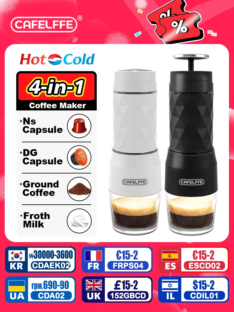 Cafelffe 3인1 휴대용 커피 머신, 핫/콜드 수동 에스프레소 메이커, 캡슐 및 그라운드 핸드 프레스 브루어, 하이킹 여행, 연인과 아빠, 엄마를 위한 선물.