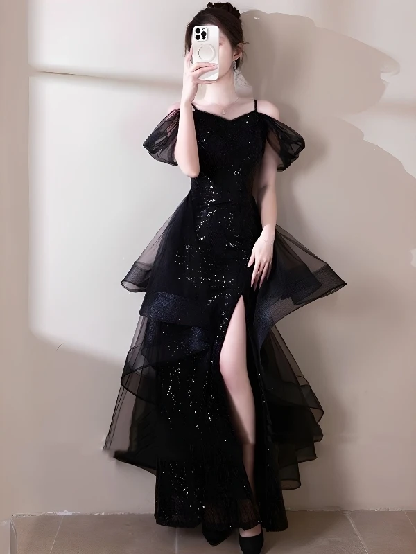 우아한 블랙 섹시 스트랩리스 드레스 여성용 고급 럭셔리 프린세스 스타일 미드웨이스트 A라인 스커트 롱 이브닝 드레스